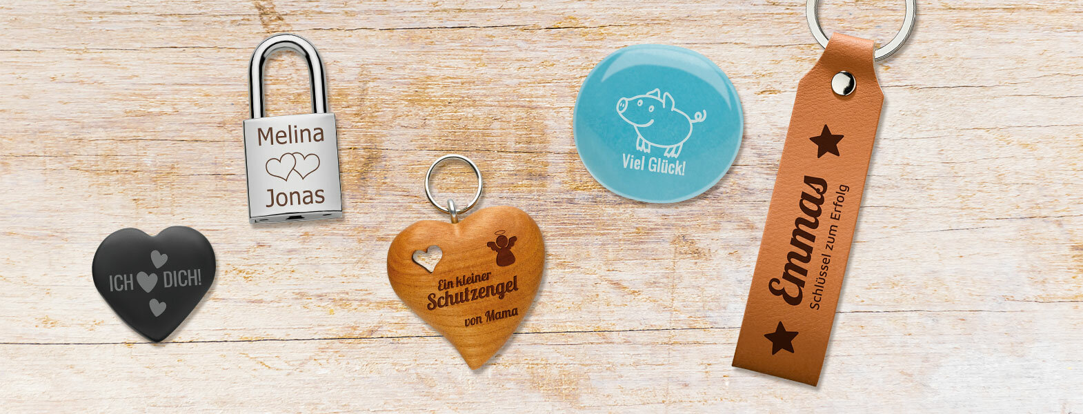 Schnell und einfach zu einem schönen Ergebnis kommen Sie hierbei mit dem Onlinegestalter. Wählen Sie einfach Ihr gewünschtes Gravur Geschenk aus, platzieren Sie Ihre persönliche Widmung und ein passendes Symbol für Ihren Anlass - fertig. Online finden Sie vom gravierten Schnuller, einem eleganten Liebesschloss oder dem beliebten Schlüsselanhänger aus Holz das gesamte Sortiment.