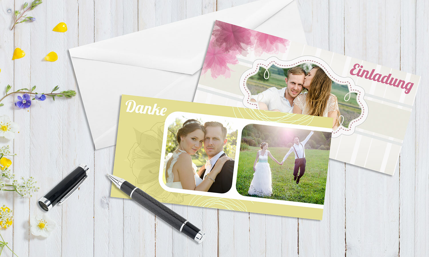 Wir bieten Ihnen eine große Auswahl diverser Kartenformate und hochwertigen Veredelungen. Beeindrucken Sie bei der Gestaltung mit unzähligen Designs passend zur geplanten Festivität. Schmücken Sie Ihre Karten mit Ihren eigenen Fotografien und verspielten Cliparts. Für einen besonders persönlichen Touch platzieren Sie noch einen eigenen Text auf der Vorder- und Innenseite. All dies gelingt Ihnen spielend leicht mit der kostenlosen Bestellsoftware von dm Foto Paradies.