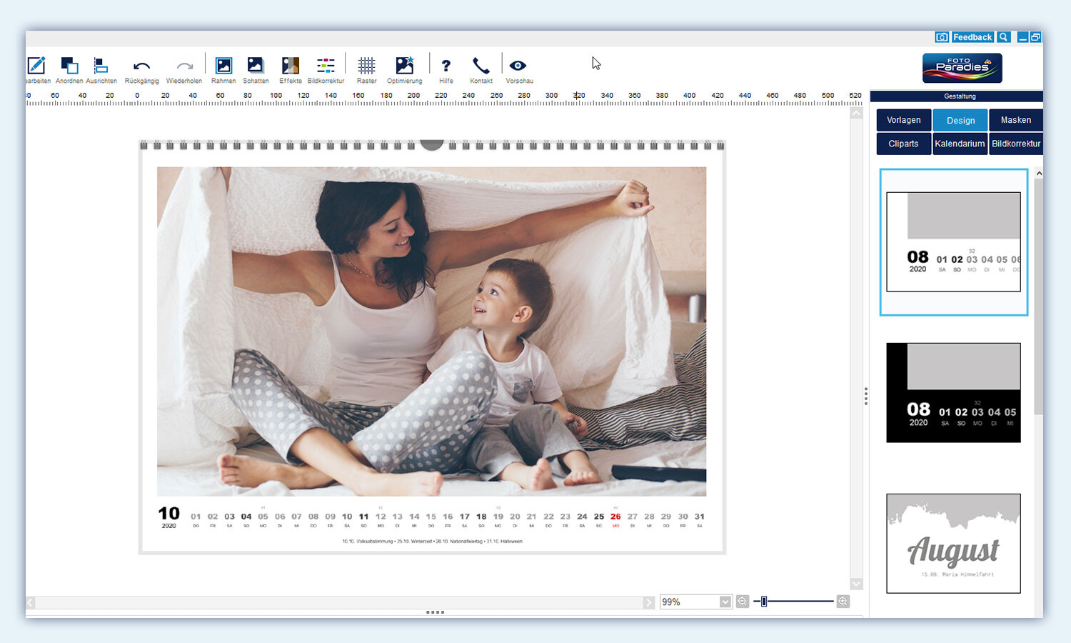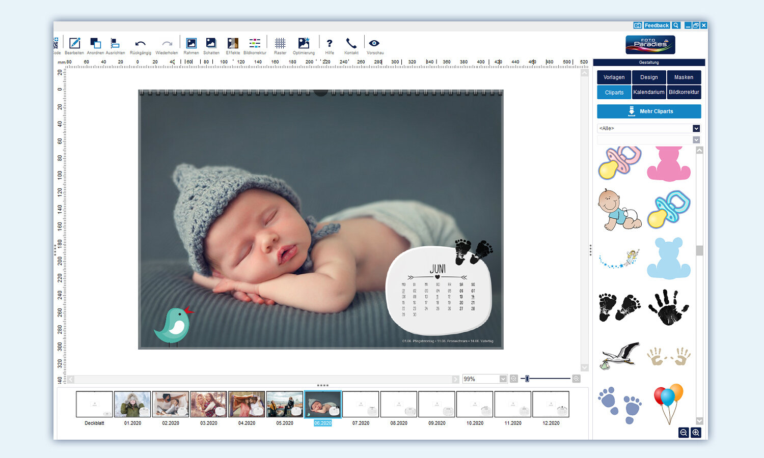 Für die Gestaltung Ihres individuellen Kalenders empfehlen wir Ihnen die kostenlose Bestellsoftware von dm Foto Paradies. Hier stehen Ihnen unzählige Möglichkeiten zur Individualisierung Ihrer Kalender zur Verfügung. Wählen Sie für jedes Kalenderblatt Ihre Wunschvorlage aus und bestücken Sie so Monat für Monat mit Ihren Bildern & Collagen. Verwenden Sie ganz nach Belieben Cliparts, Hintergrundmuster oder Farben und Bildmasken. Zusätzlich haben Sie die Möglichkeit, Feiertage im Kalendarium ein- oder auszublenden.