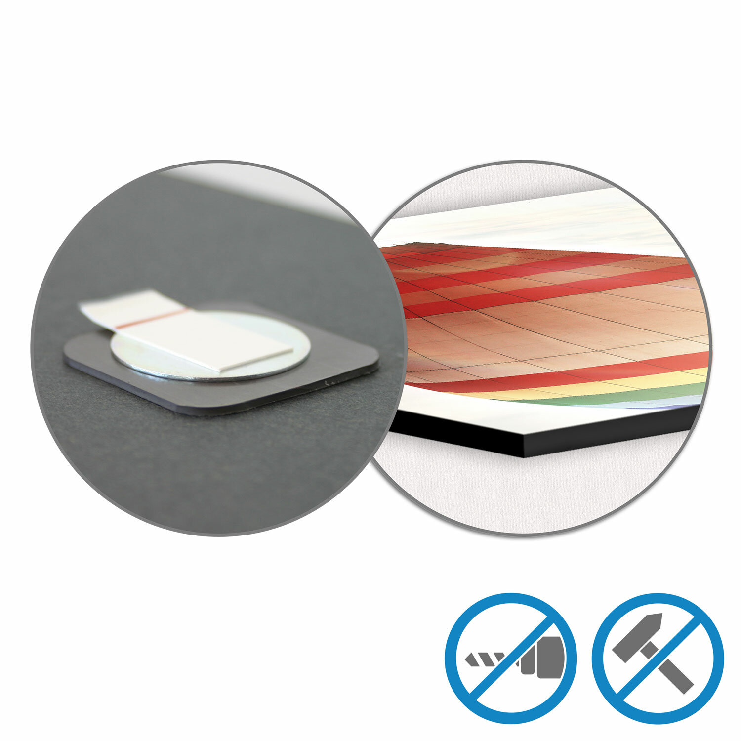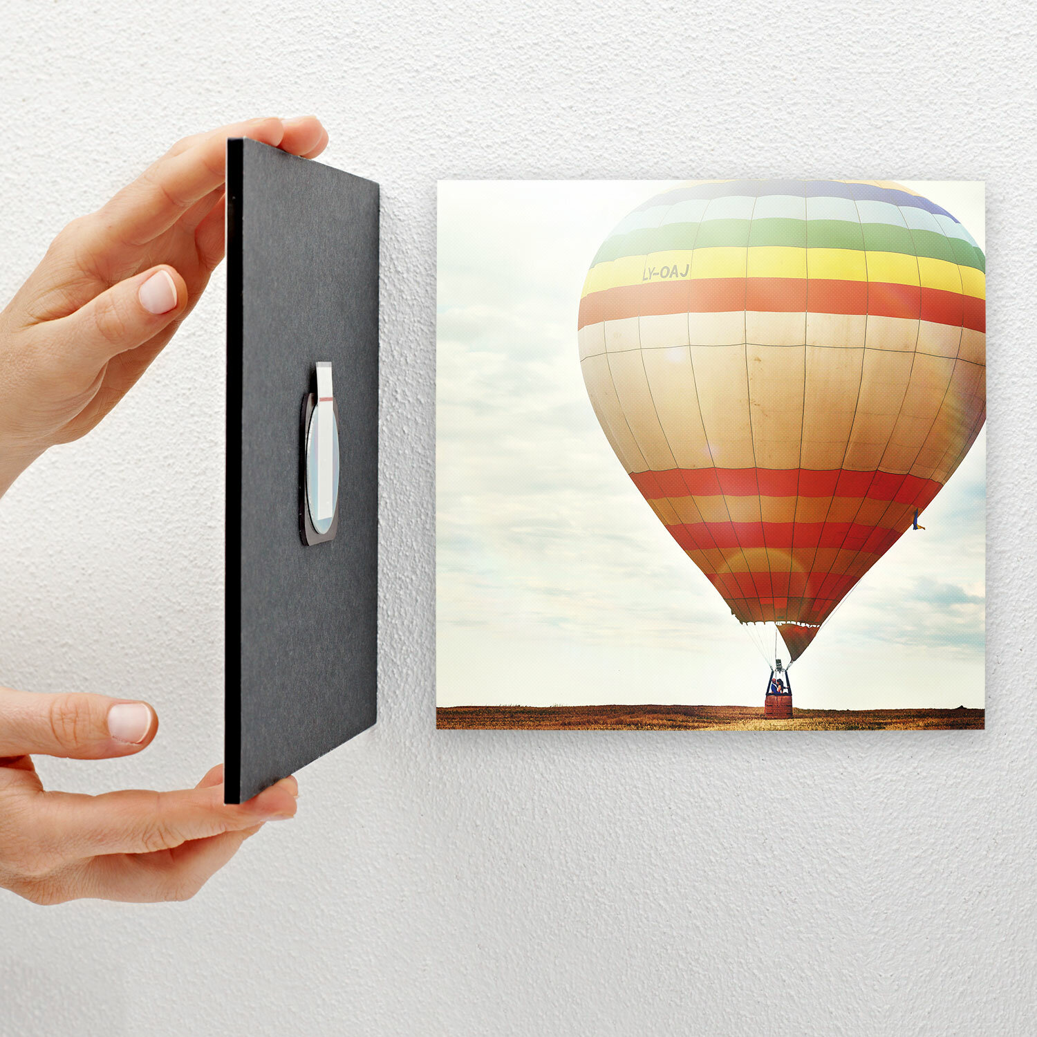 Das fertige Foto kaschieren wir anschließend auf eine stabile und zugleich federleichte Hartschaumplatte. Für eine neutrale Optik ist diese platte in Schwarz gehalten. Auf der Rückseite der Hartschaumplatte befestigen wir für die Aufhängung eine Magnetplatte. Diese bildet das Gegenstück zur mitgelieferten Metallscheibe, welche Sie mit einem bereits vorbereiteten Klebestreifen an der Wand befestigen. In Kombination erhalten Sie so ein praktisches Aufhängesystem, welches weder Bohren noch Hämmern erfordert. Und keine Sorge – der Klebestreifen lässt sich rückstandslos und ohne Schäden an Tapete oder am Putz wieder entfernen.