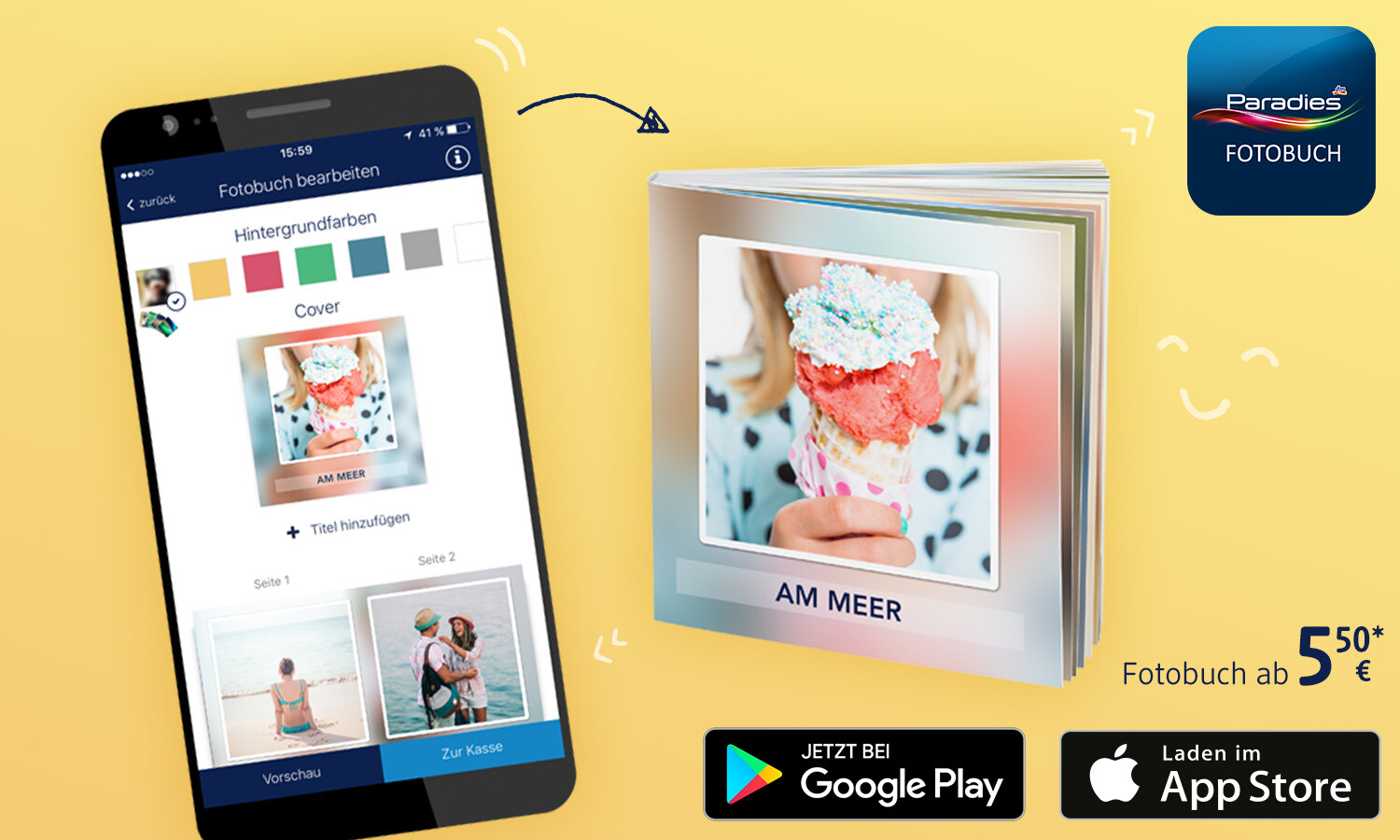 Erstellen Sie Ihr Paradies Fotobuch überall und jederzeit. Ob am Strand, im Skilift, in der Bahn oder Zuhause – mit der „1-Klick-Fotobuch“-App von dm Paradiesfoto halten Sie Ihre Erinnerungen ganz einfach und in einem sympathischen Buchformat fest.