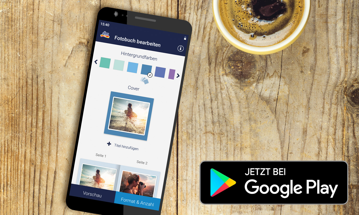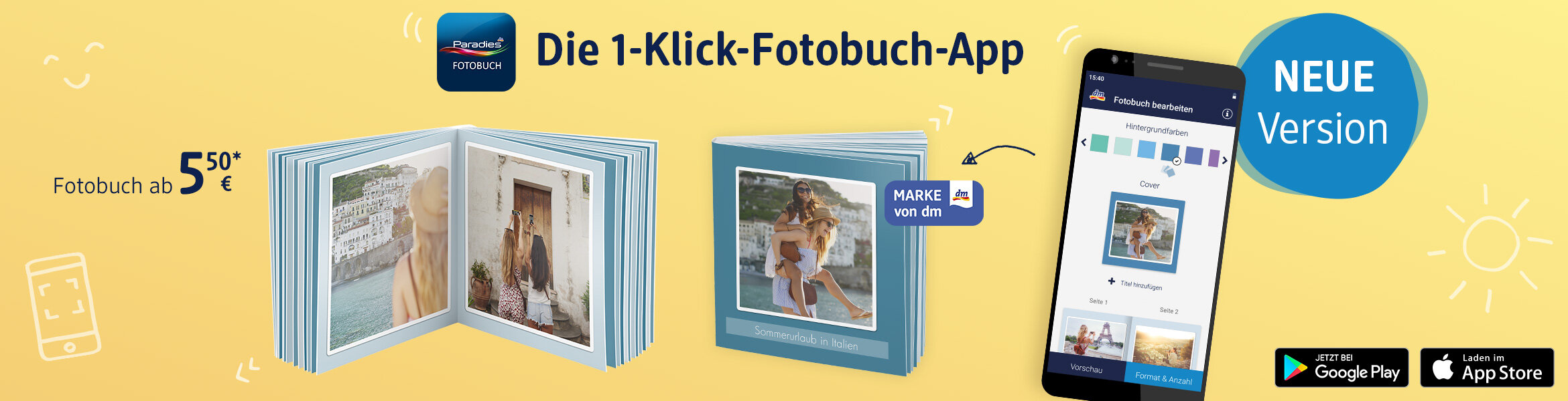Erstellen Sie Ihr Paradies Fotobuch überall und jederzeit. Ob am Strand, in der Bahn oder Zuhause – mit der „1-Klick-Fotobuch“-App von dm Paradiesfoto halten Sie Ihre Erinnerungen ganz einfach und in einem sympathischen Buchformat fest.